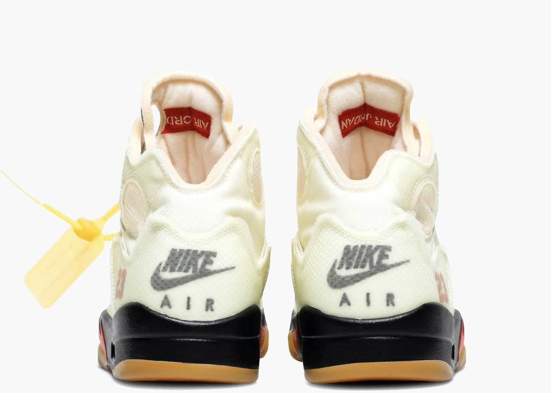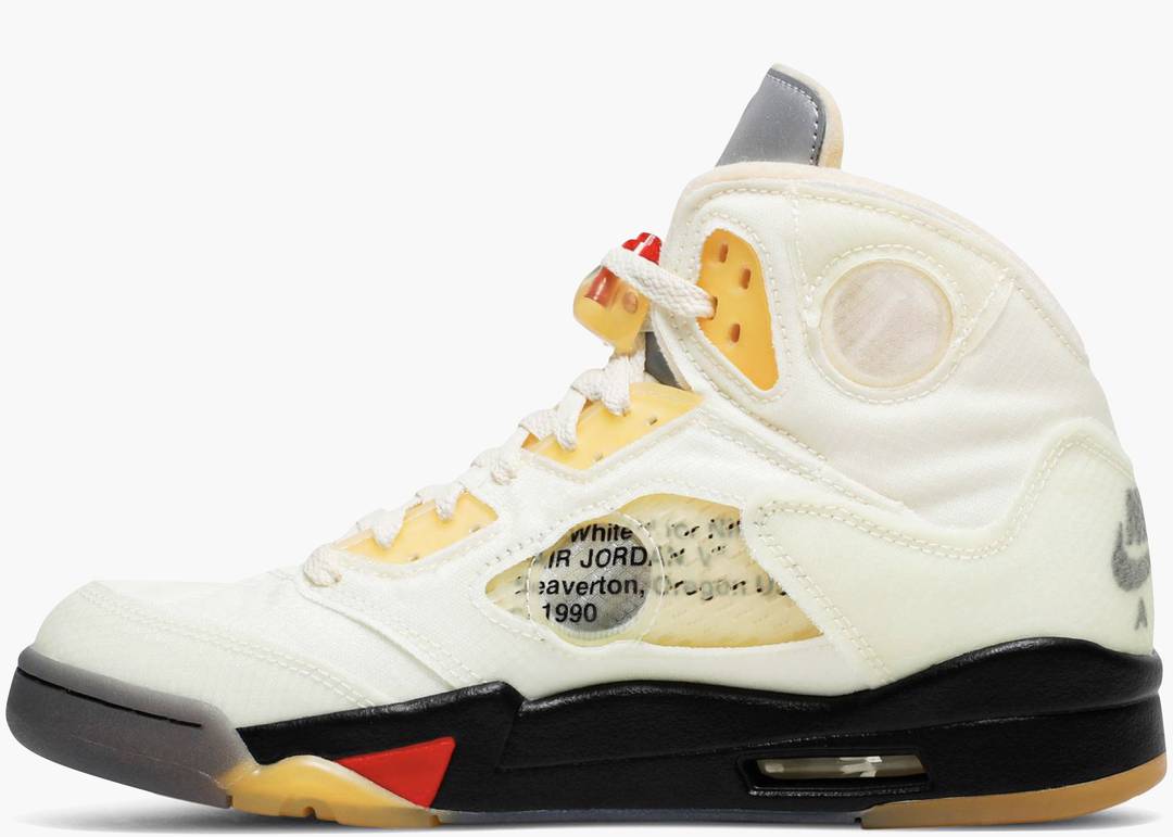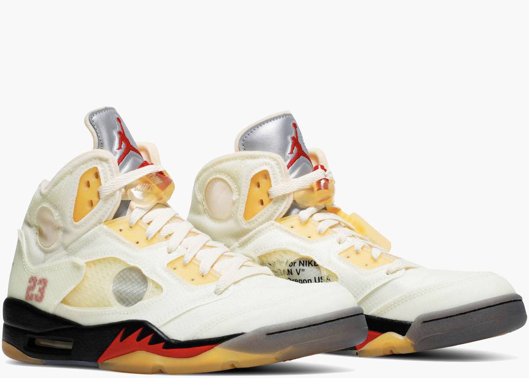 Virgil Abloh ha aggiunto una seconda colorazione alla sua collaborazione Jordan 5. Questa scarpa rende omaggio alla prima Jordan che Virgil abbia mai posseduto, l'Air Jordan 5. In modo esclusivo, Virgil ha reinventato questa silhouette classica. Caratterizzata da una tomaia in mesh in tessuto con pannelli a rete traslucidi. Le linguette riflettenti 3M, il marchio Jordan rosso fuoco e una suola traslucida invecchiata completano il design. Data di rilascio: 29 ottobre 2020.