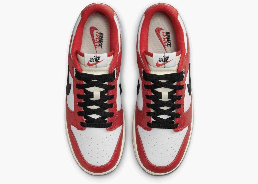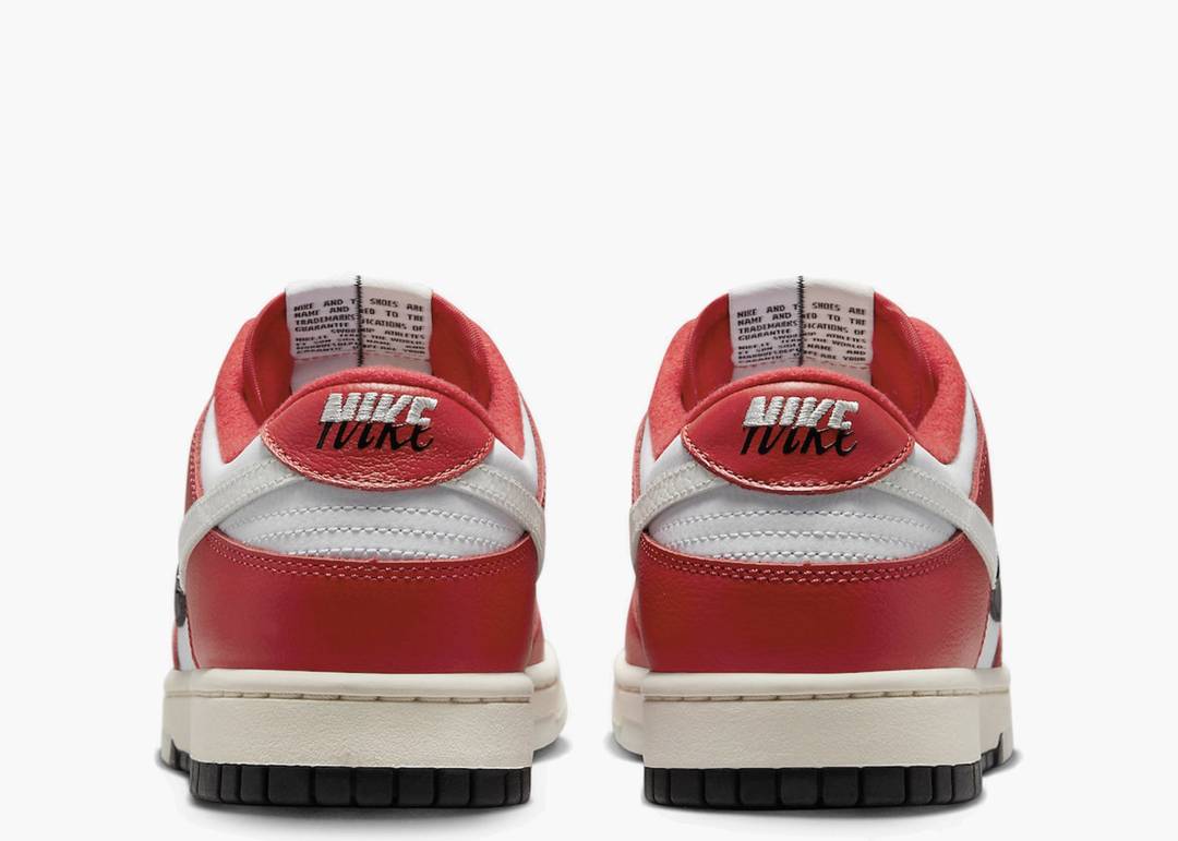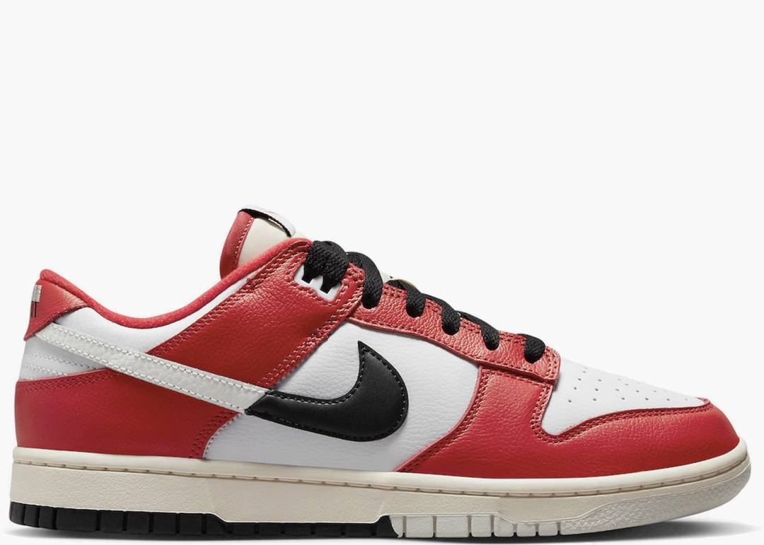 The Nike Dunk Low Chicago Split features an all-leather construction with mesh tongues. The shoe features a White base with Red overlays atop a Sail midsole. Its split design is found on the tongue labels, swooshes and rubber outsole. The shoe will also come with an extra set of laces.