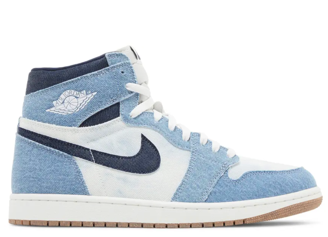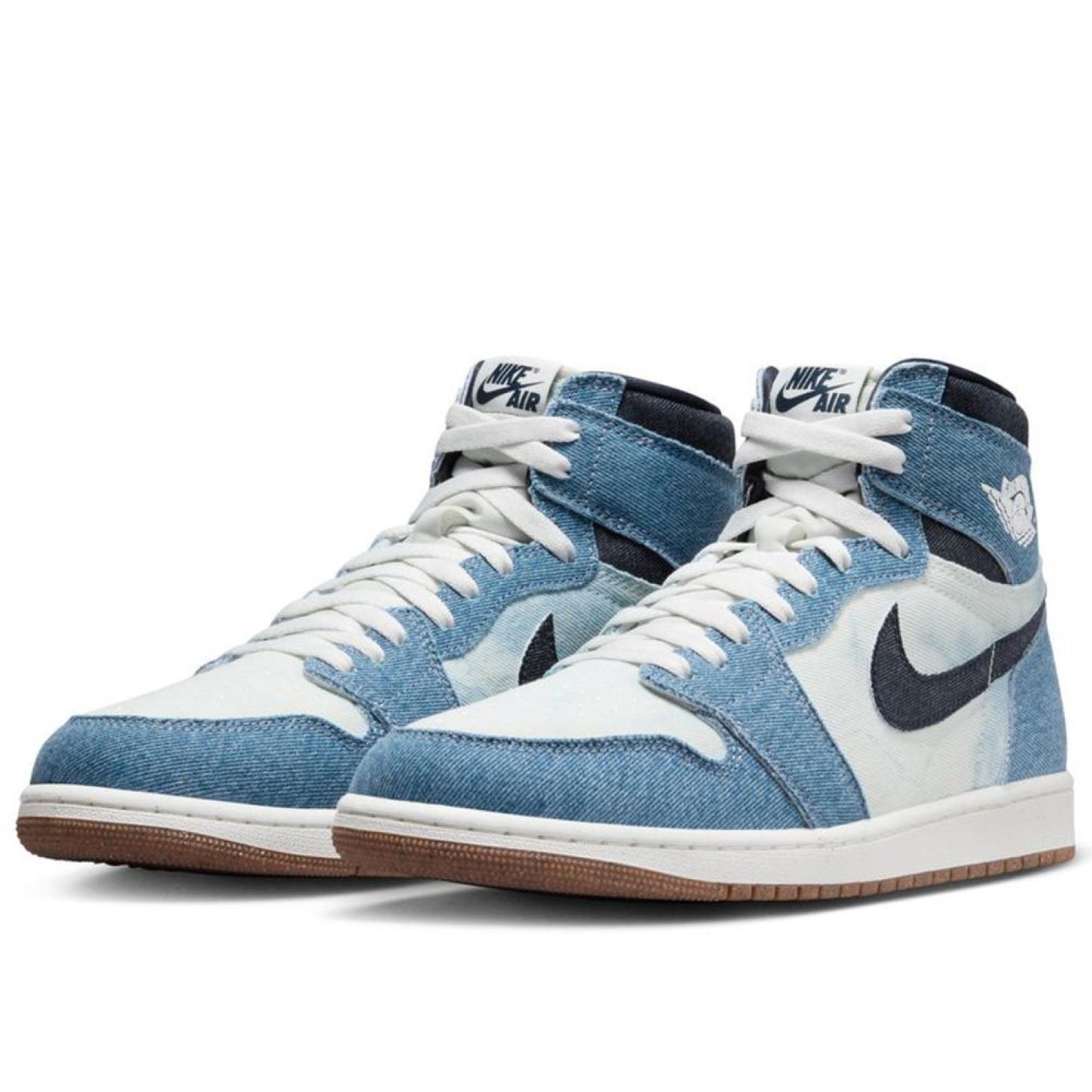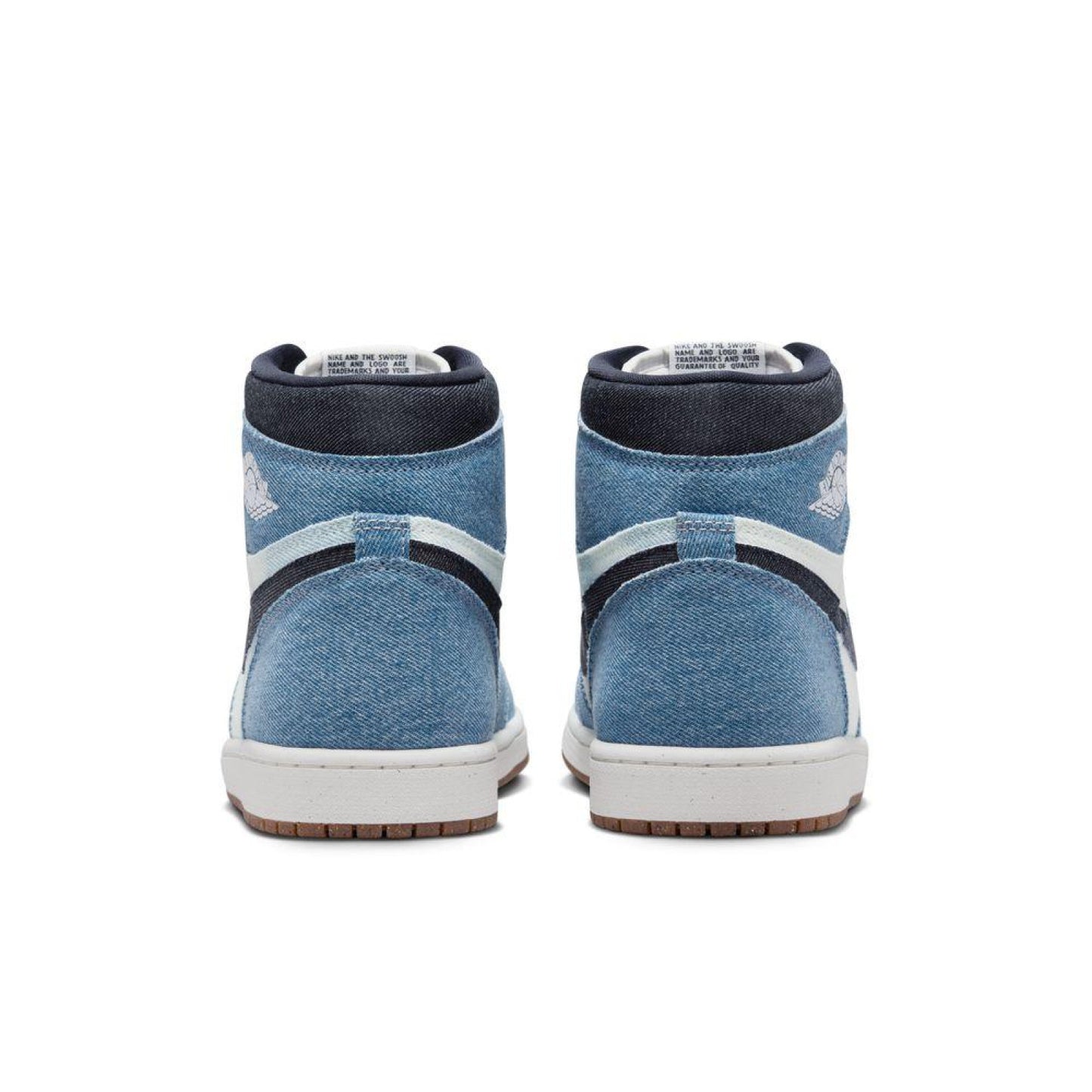 La Jordan 1 Retro High OG Denim presenta un mix di colori summit white, obsidian e gum Medium Brown. La sneaker ha una base in tela Summit White con rivestimenti in tessuto denim con una tonalità più scura che si estende sui colletti e sui loghi Swoosh e aggiungono un tocco di stile a questa nuova versione.