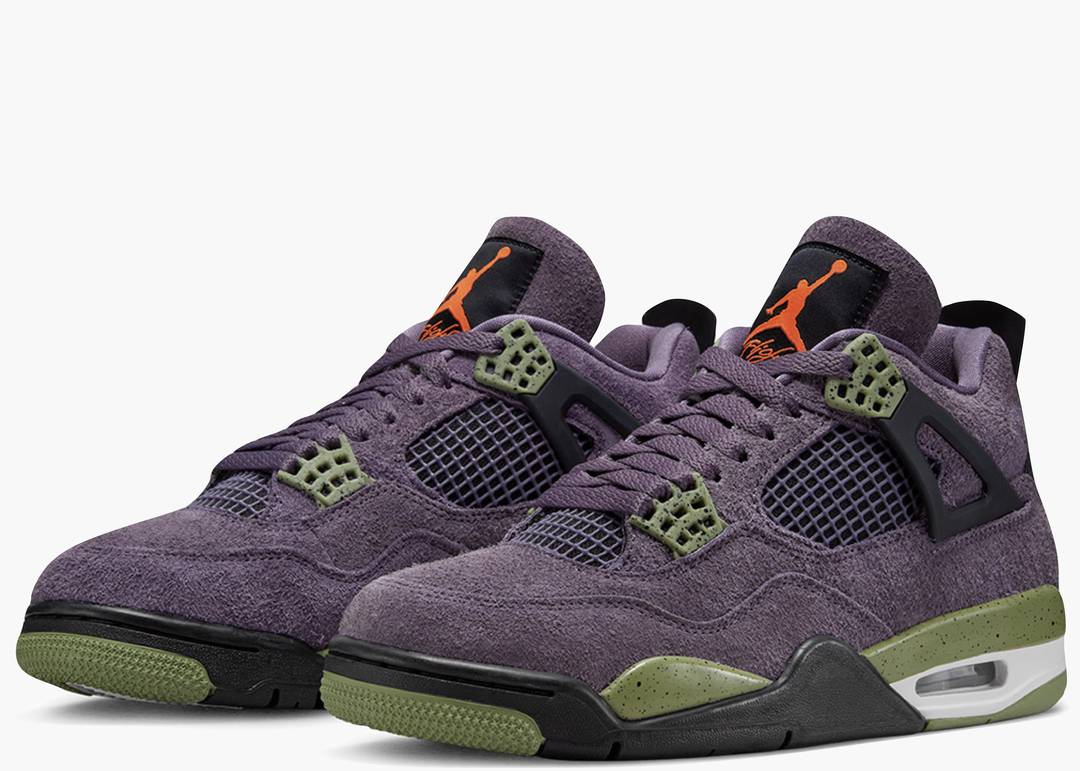 Dressed in a Canyon Purple, Anthracite, Alligator, and Safety Orange color scheme – this Jordan 4 Retro Canyon Purple features a Purple suede base paired with Charcoal hits on the mesh, tongues, wings, heel tabs, and laces. Contrasting green accents on the speckled eyelets and pops of orange outsole complete the design.