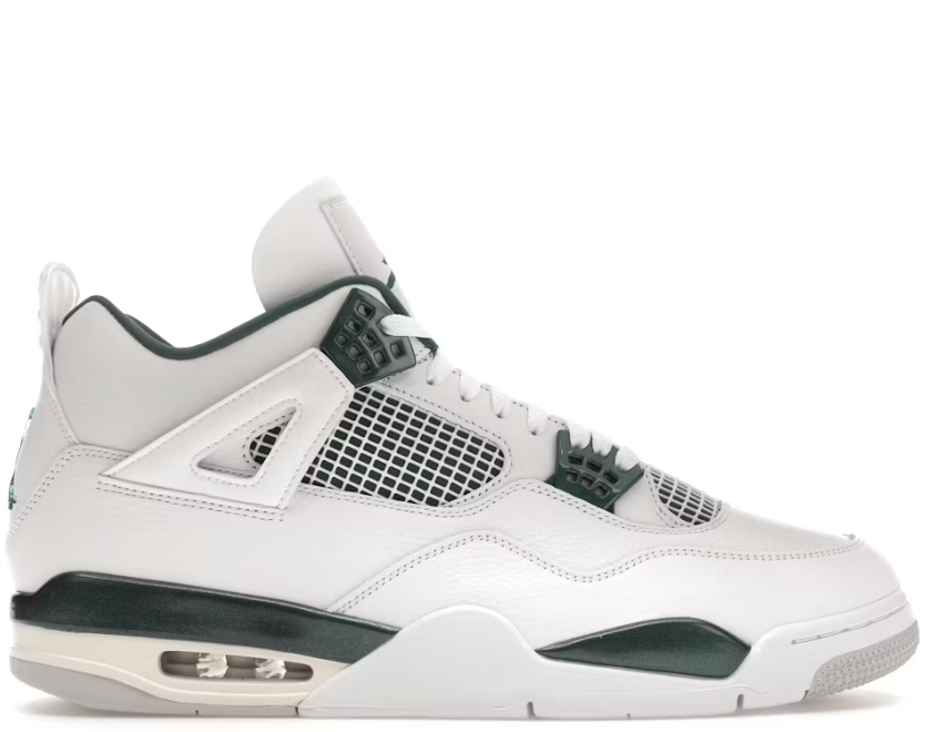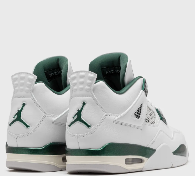 The Jordan 4 Oxidized Green has a white leather base. Oxidized Green accents are found on the support wings, midsole, Jumpman logos and inner lining. A white midsole with visible Air cushioning and a durable rubber outsole in Neutral Gray complete the shoes. The pair comes packaged in a retro-inspired shoe box in a green hue.