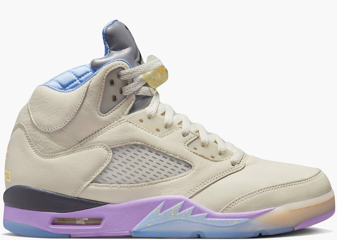 Jordan 5 Retro DJ Khaled We The Best Sail - Questa collezione include quattro opzioni di colore Air Jordan 5 vestite nelle tonalità Crimson Bliss, Sail, Blue e Bright Purple. Ogni paio presenta tomaie in pelle, accenti colorati a contrasto, talloni marchiati "We The Best" e "Nike Air", fodera interna trapuntata con etichette "Keep" e "Going" sulle linguette interne. Completano il design le suole traslucide con "We The Best" sotto il piede della scarpa giusta.
