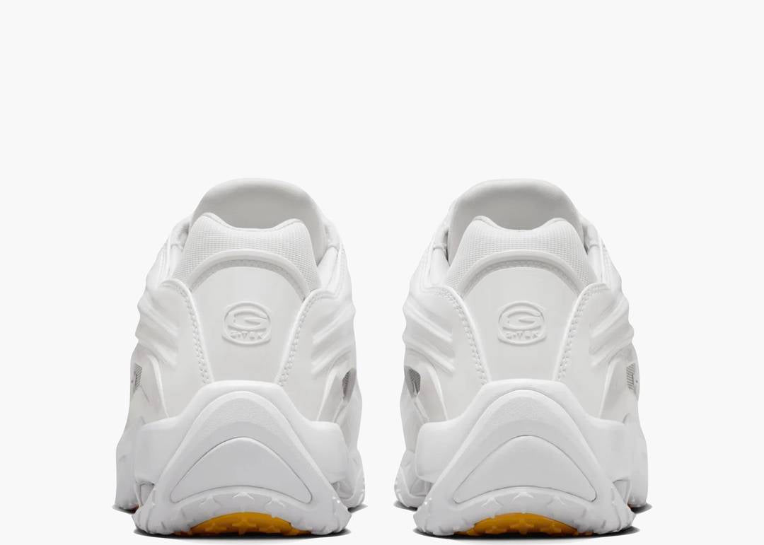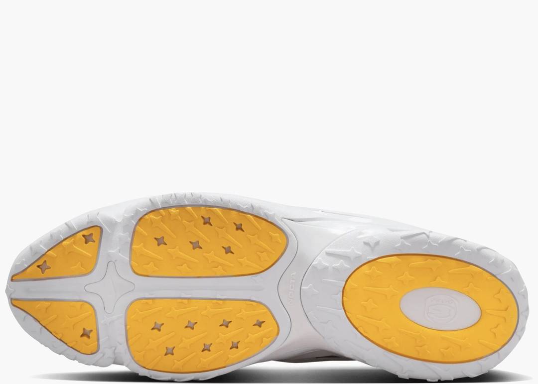 The Nike Hot Step 2 Drake NOCTA White features a mix of White, Chrome and University Gold tones, fusing breathable mesh with synthetic leather overlays for a futuristic look. Chrome accents adorn the mini Swoosh logos, TPU overlays, and rear tabs, adding a touch of elegance. The NOCTA branding on the tongue recalls the collaboration while the foam midsole with Air cushioning ensures style and comfort to the sneakers.