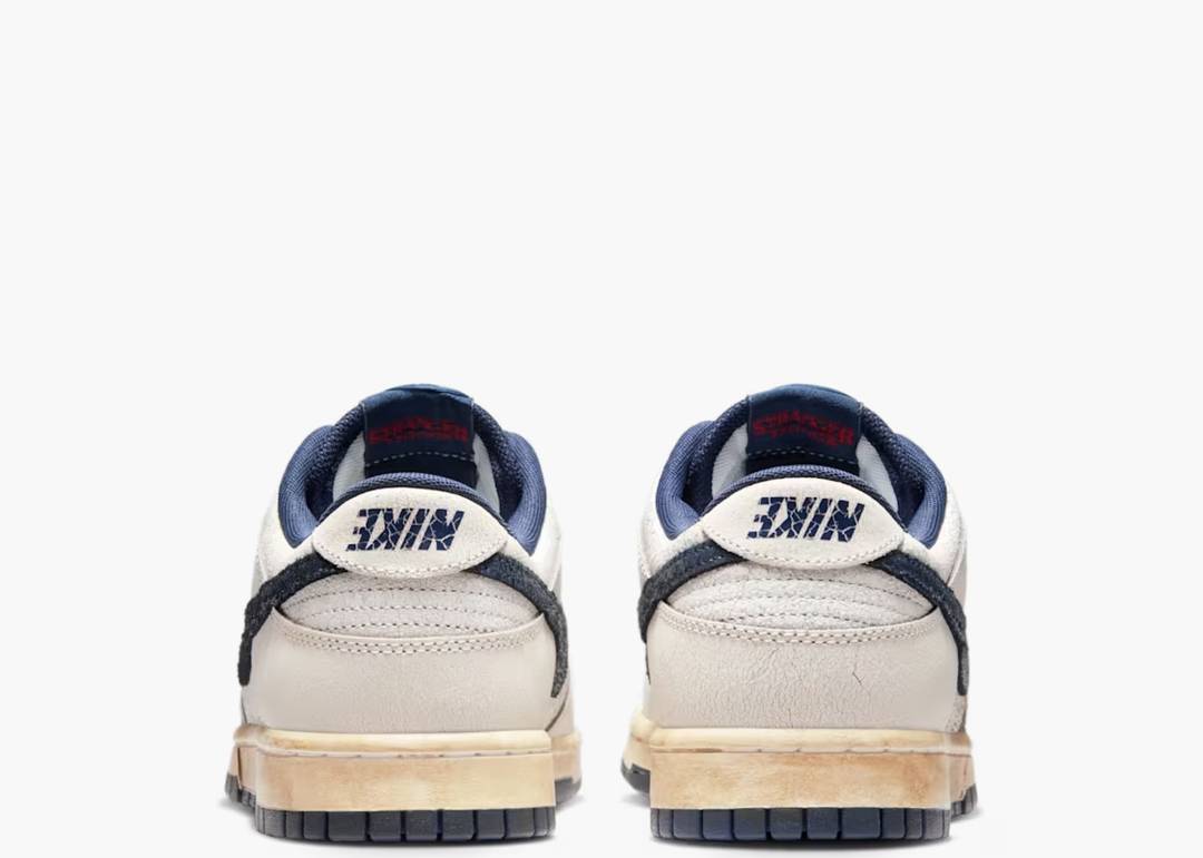 La Dunk Low Stranger Things Phantom torna ad Hawkins per celebrare l'uscita dell'ultima stagione della serie. La sneaker si presenta con una tomaia che mescola Phantom, Midnight Navy e College Grey con inquietanti accenti Lemon Drop e Varsity Red. Cracked leather, Swoosh Nike invertiti e accenti pseudo-scritti a mano sono un riferimento diretto al Sottosopra, mentre l'intersuola ingiallita richiama un effetto sbiadito anni '80.